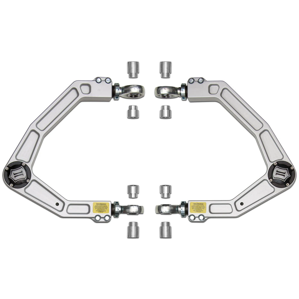 This ICON billet aluminum upper control arm kit is designed to improve the overall performance of the new Ford Raptor with corrected front end geometry, adjustable camber and caster, and improved suspension component clearance. These are constructed of CNC machined 6061 billet aluminum merging light weight with high strength properties. Replacing the OE ball joint with the available ICON Delta Joint allows for full bump and droop travel of the front suspension while eliminating bind. FK Rod End 7/8″ heim joints provide precise and smooth function throughout the range of travel while ICON’s signature double adjuster sleeve allows for on-vehicle camber and caster adjustment. Included with all components and hardware necessary for a complete install, these billet UCAs are the perfect upgrade for the 2010-2020 Ford Raptor. These upper control arms feature ICON’s patented Delta Joint. The Delta Joint is a heavy duty high angle ball joint that combines the durability of a ball joint with the performance characteristics of a traditional uniball. While the industry standard uniball does a great job of allowing the control arms of a vehicle to articulate with little bind, they do have an inherent weakness that leaves more to be desired when used in a daily driven application – exposure to the elements. The Delta Joint features a zinc plated housing providing the first layer of corrosion resistance, while a tough grease seal keeps potentially harmful elements out of the inner workings of the joint. Metal on metal construction and a greasable design increase the longevity of the Delta Joint while at the same time allowing for noise-free operation. What makes the Delta Joint unique is that it brings the best of both worlds to ICON upper control arms with features that make it more robust than a uniball, and at the same time capable of greater angularity than a typical ball joint.
